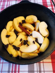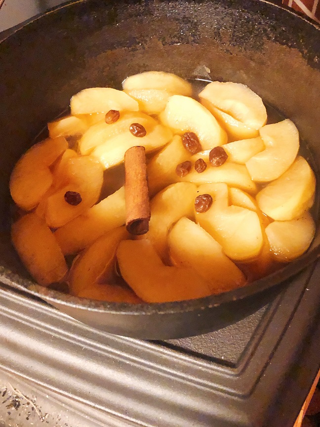 - 砂糖、干し葡萄、シナモンスティックを入れて煮込む。干し葡萄は味に深みを出す。